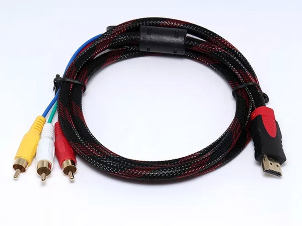 O cabo serve como adaptador para a conversão de sinal entre HDMI e 3x cabos RCA. A parte HDMI do cabo possui um conector macho.