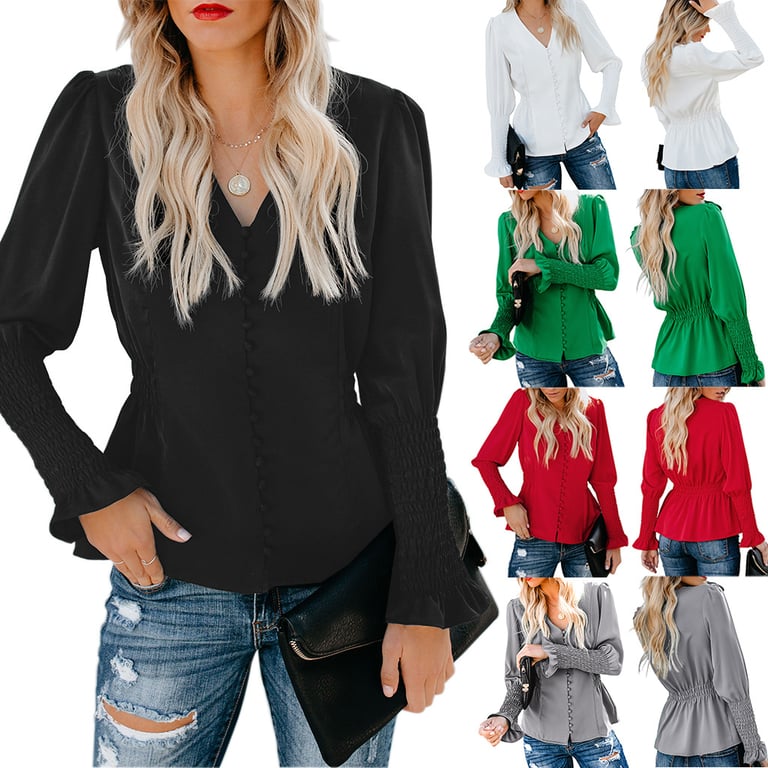 Blusa de negócios feminina com fecho de botões. Tem mangas longas e franzidas, que são ligeiramente volumosas nos ombros.