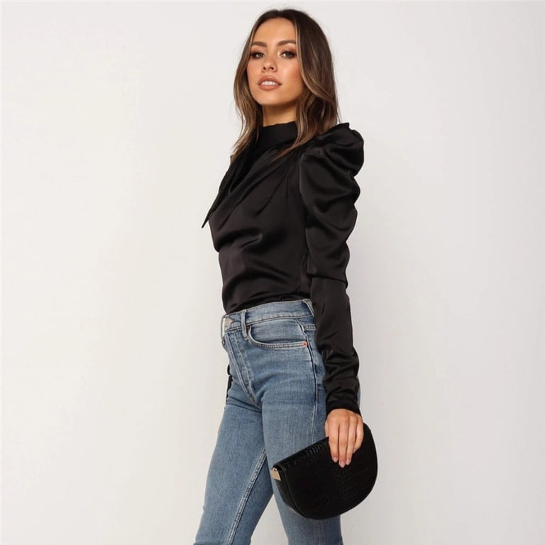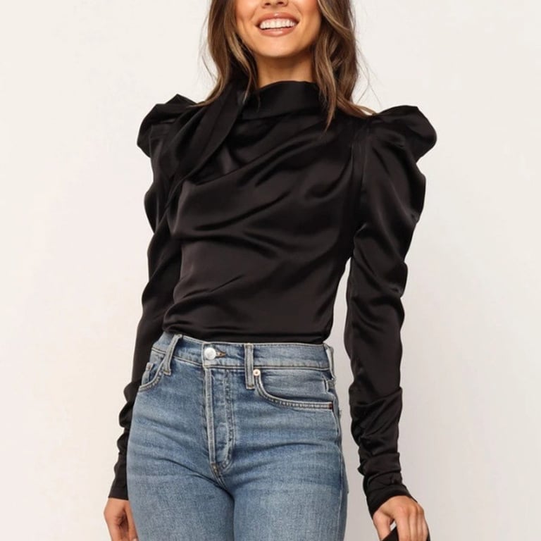Blusa feminina com mangas longas de design interessante. Corte justo com franzido. Material liso e brilhante. Disponível em várias opções de cores.