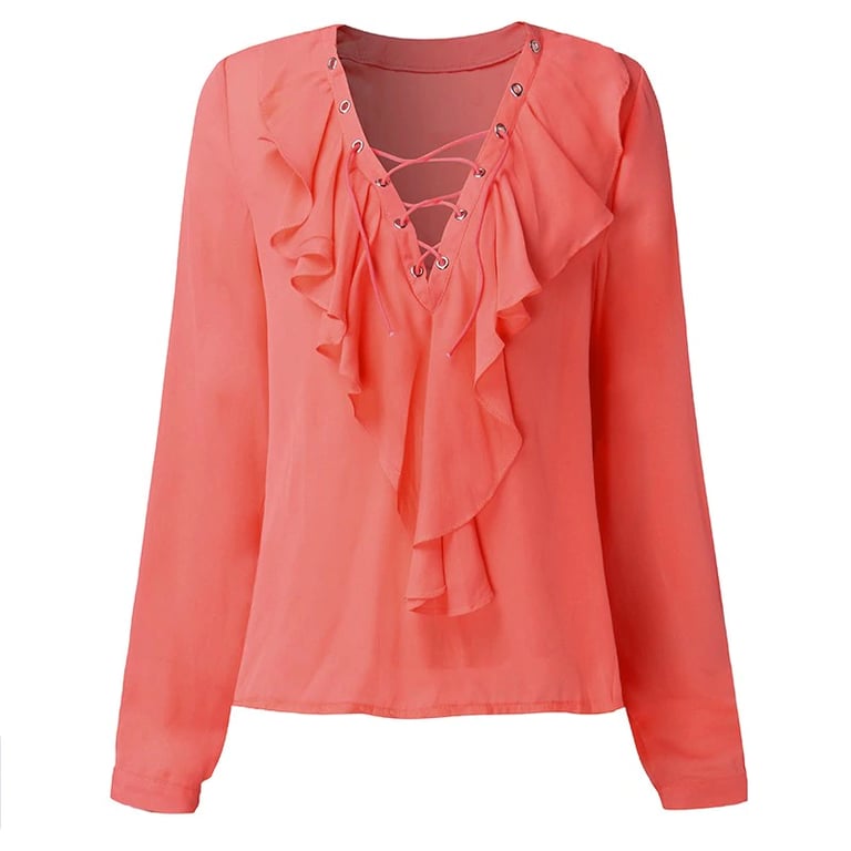 Blusa feminina de mangas longas. Tem decote em V com amarração e é adornada com um babado.
