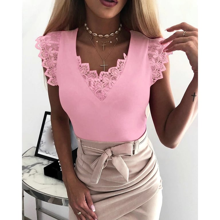 Blusa feminina com mangas curtas de renda e renda na gola. Disponível em lindas cores vibrantes.