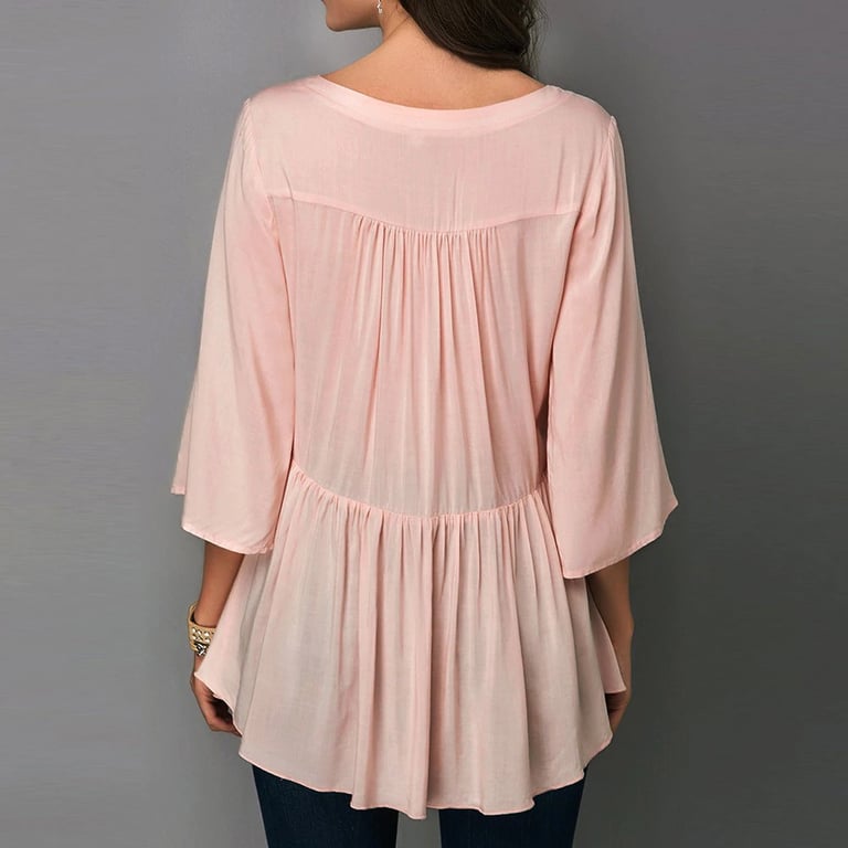 Blusa feminina rosa com mangas 3/4. Tem decote em V. Corte romântico delicado.