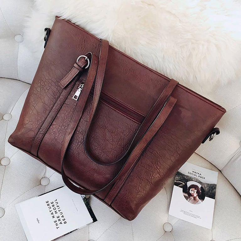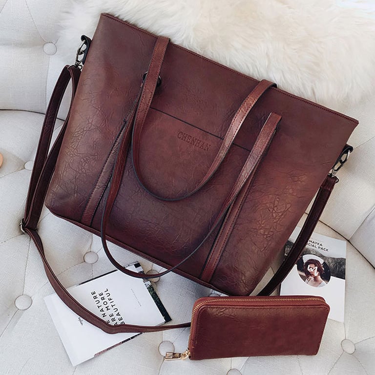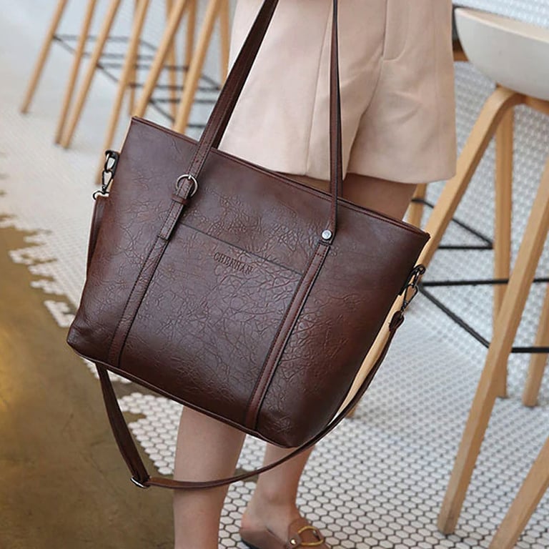 Grande bolsa de senhora e carteira com aparência de couro. A bolsa tem uma alça grande para a mão e uma alça adicional longa para o ombro, possui um bolso lateral e fecho com zíper. Disponível em várias opções de cores.