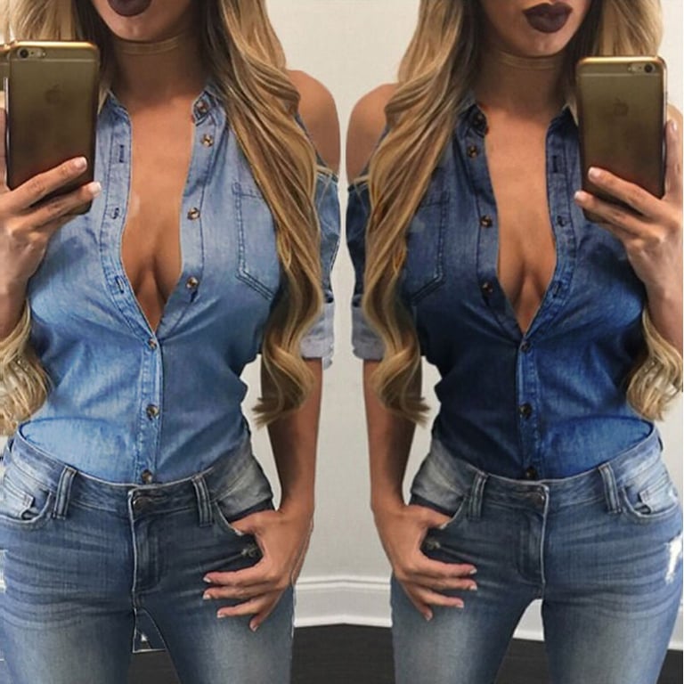 Camisa de ganga feminina com ombros à mostra