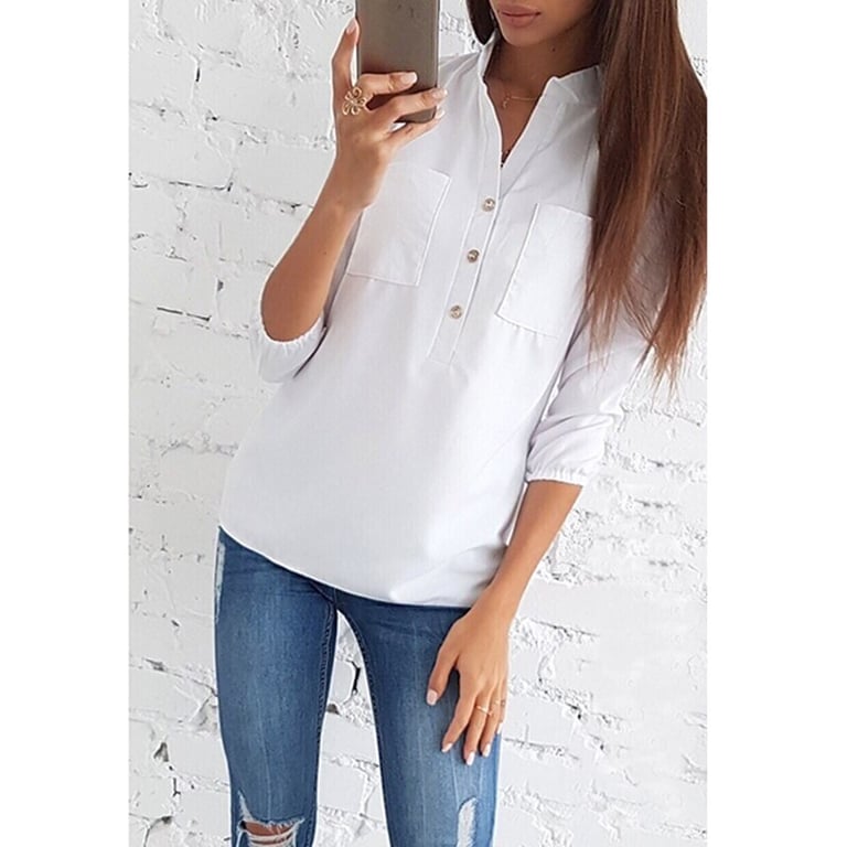 Camisa feminina de cor sólida com decote em V. É adornada com 3 botões. Corte elegante.