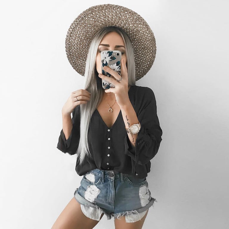Esta linda camisa feminina tem botões brancos decorativos. É ligeiramente franzida na cintura com elástico e tem um decote profundo em V. Um corte elegante que favorece todas as mulheres.