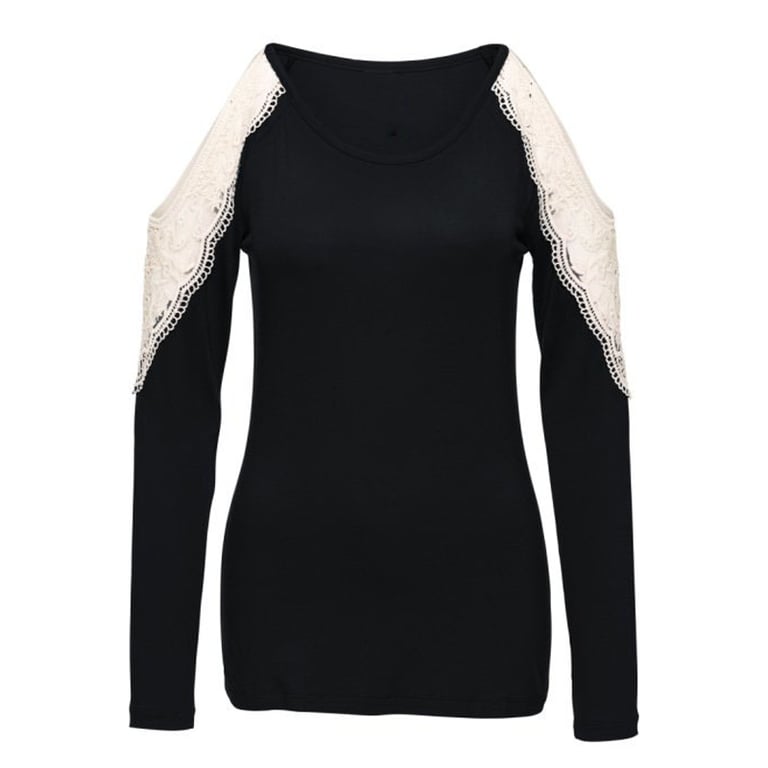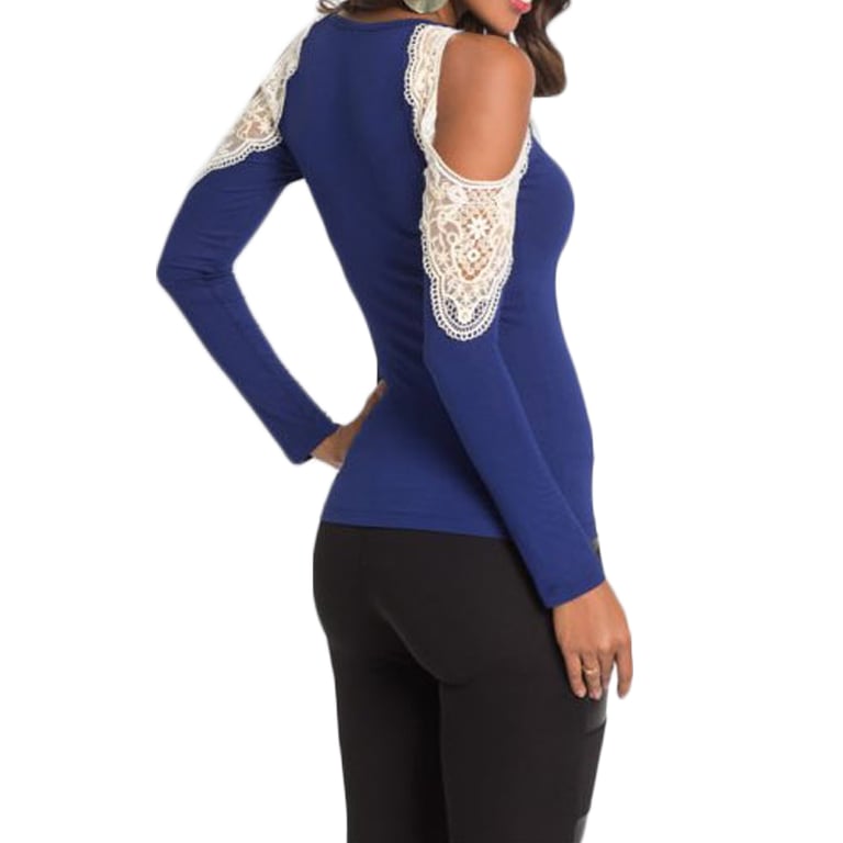 Linda t-shirt feminina com ombros à mostra, decorada com renda. Corte elegante.