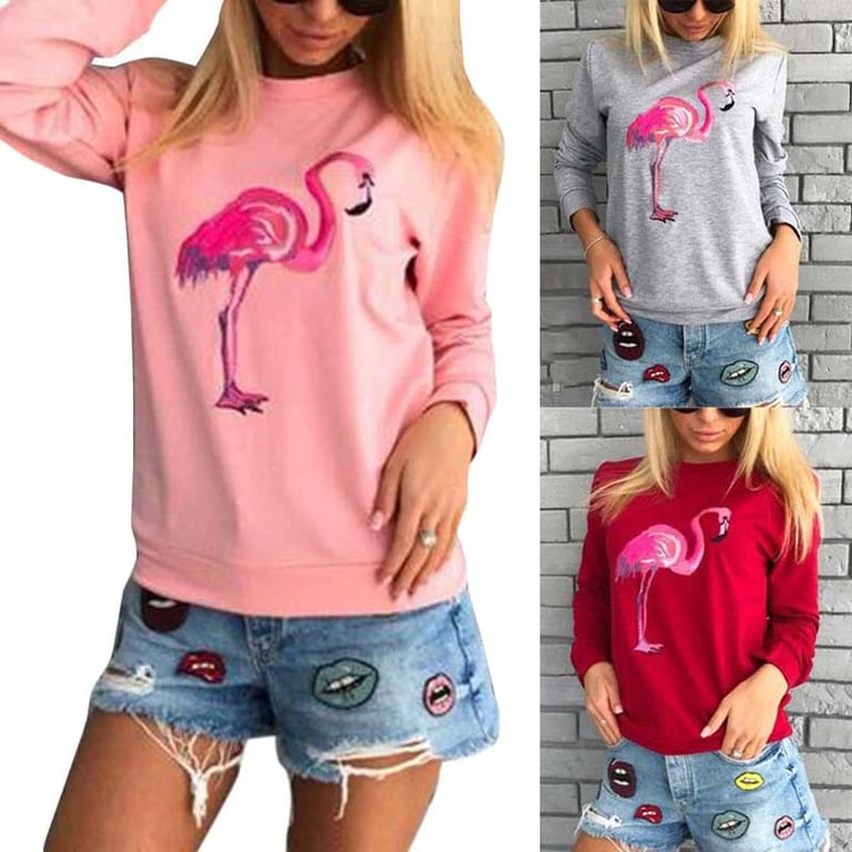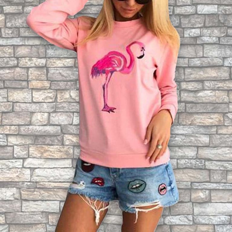T-shirt estiloso de manga longa com um motivo de flamingo, que parece incrível e ainda vai estar na moda – os flamingos estão em alta!