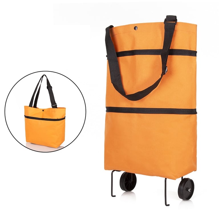 • As rodas podem ser dobradas e você terá uma bolsa de ombro, ou podem ser estendidas para o tamanho completo e você terá um cesto de compras. Após a completa extensão, a bolsa ficará em pé sozinha. Sempre que precisar, abra o fecho na bolsa e a bolsa de compras se expandirá.