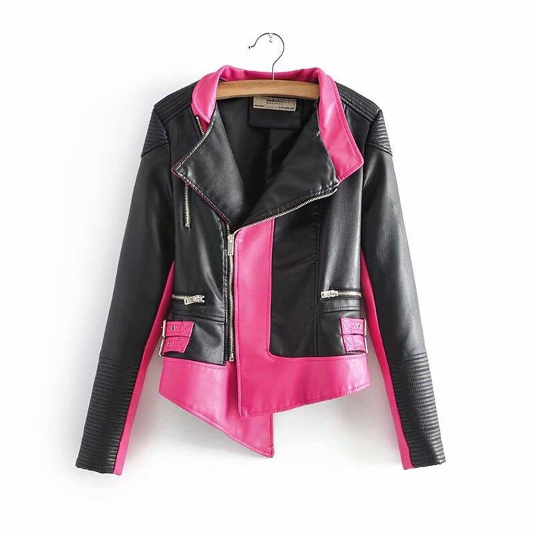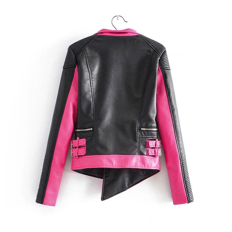 Casaco brilhante com fecho assimétrico e corte assimétrico. As fivelas decorativas são muito atraentes.