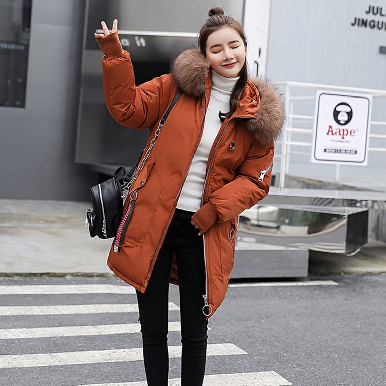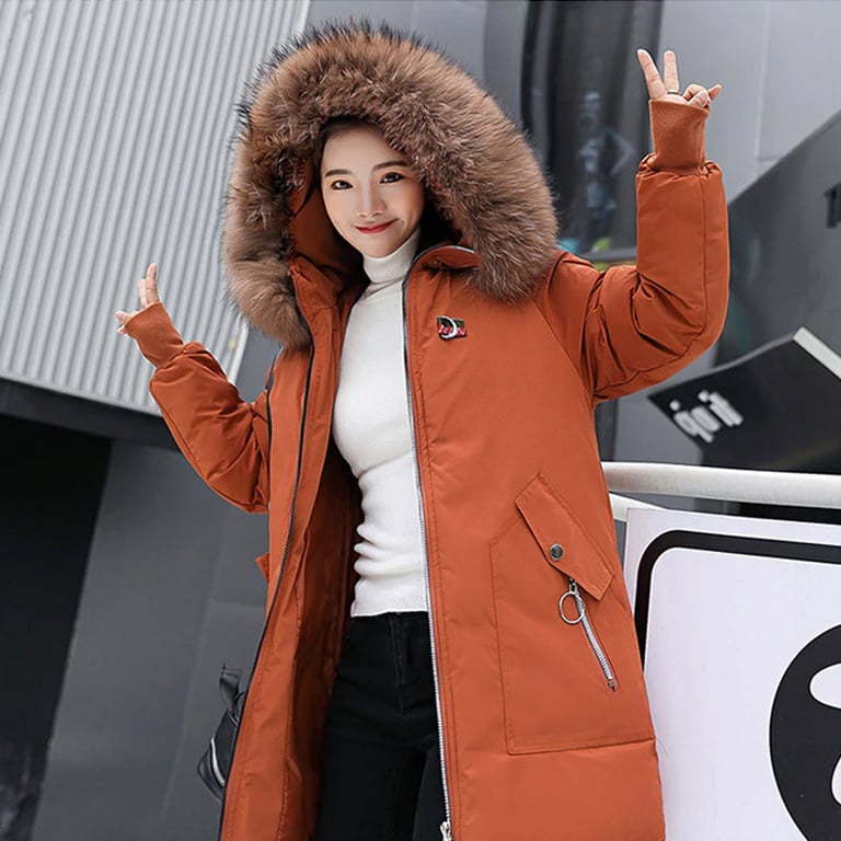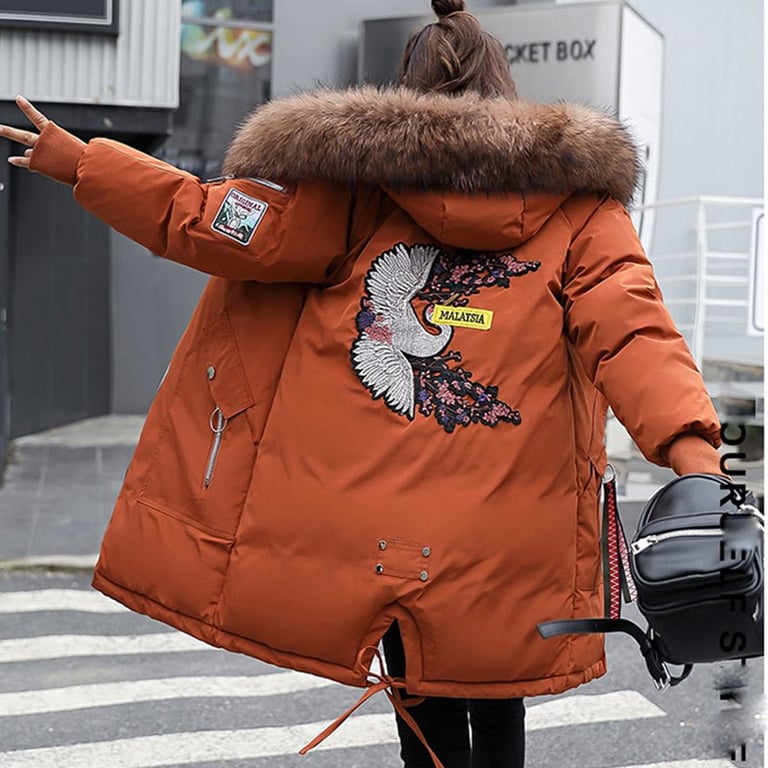 Casaco longo de inverno acolchoado com fecho de correr. O casaco é adornado com uma impressão colorida nas costas, na manga e um grande forro quente de pelúcia.