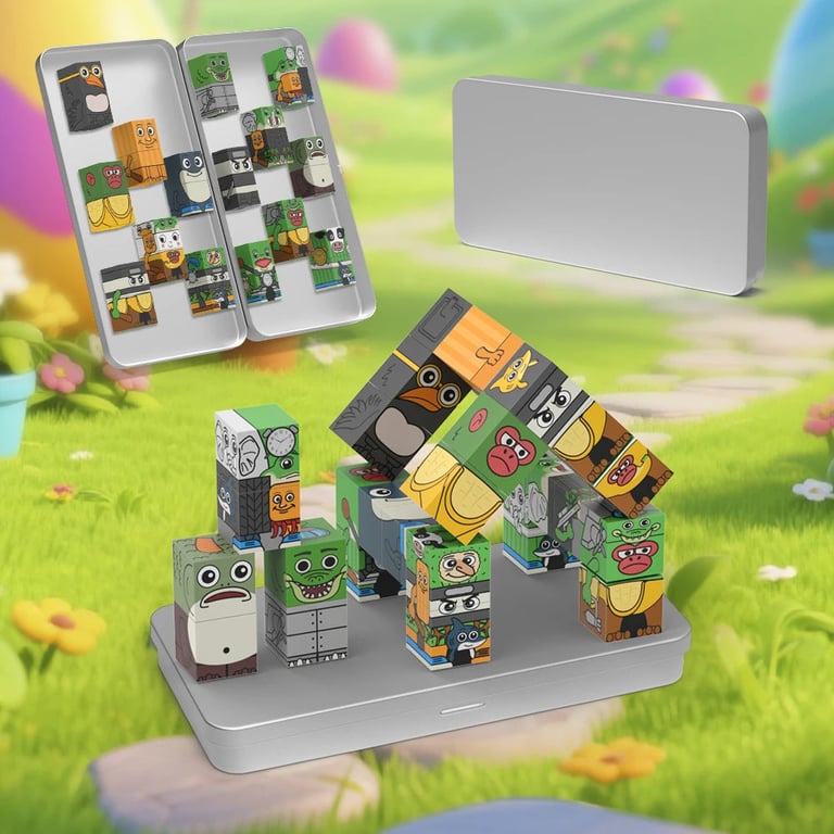 O conjunto magnético de construção Italian Brainrot oferece uma forma inteligente e divertida de desenvolver a criatividade infantil, o pensamento lógico e a coordenação motora fina. Os blocos magnéticos coloridos com rostos divertidos podem ser facilmente guardados numa caixa metálica, o que o torna um brinquedo ideal para viagens, para o carro e para levar em visitas. As crianças podem, conforme a imaginação, construir diversos animais, personagens e estruturas; os blocos unem-se facilmente graças aos ímãs e mantêm-se juntos.