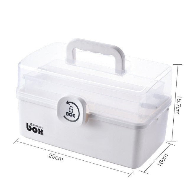 Caixa de primeiros socorros branca e prática com compartimentos de vários tamanhos.