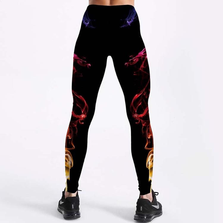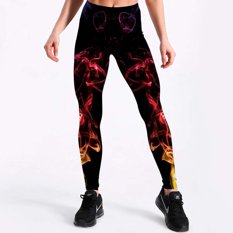 Leggings femininas estilosas com chamas coloridas. Em todas as circunstâncias, você estará confortável e parecerá ótima.