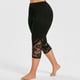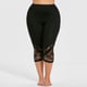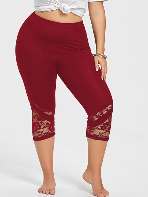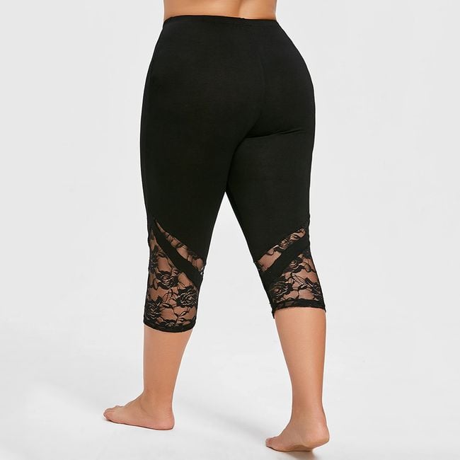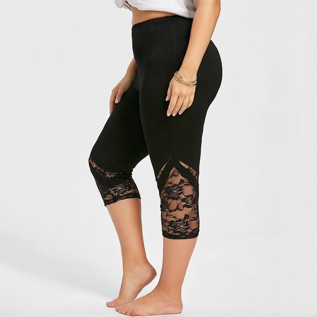 As leggings são abaixo do joelho e são adornadas com renda.
