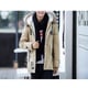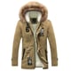 Casaco longo masculino com capuz e pelagem. O casaco tem fecho de correr, dois bolsos laterais e pode ser ajustado na cintura com cordões. Disponível em três cores – khaki, preto e verde.