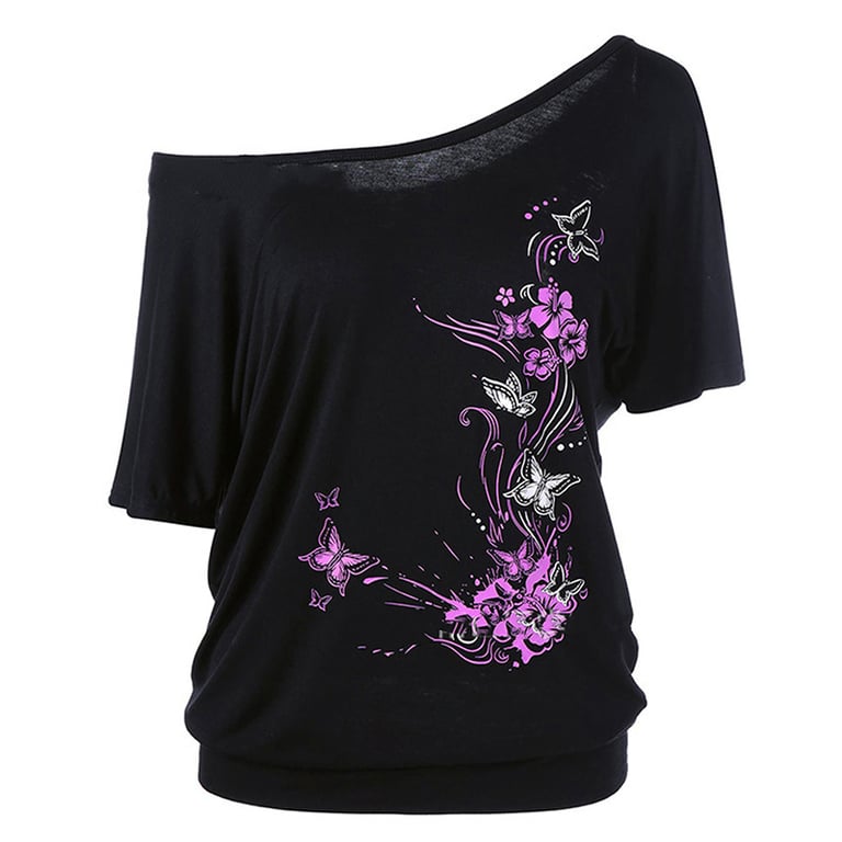 Linda t-shirt casual feminina com um ombro à mostra. Tem uma impressão delicada de borboletas e flores. Ideal para o verão.