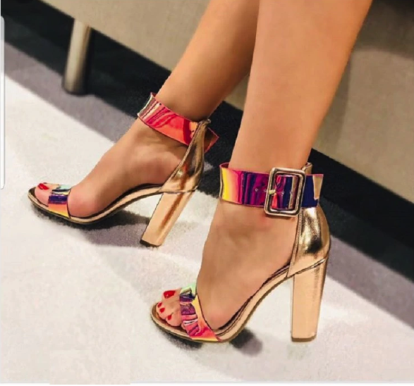 Sapatos de salto alto metálicos extravagantes e originais para mulheres.