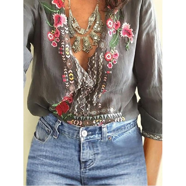 Blusa feminina colorida com apliques de flores coloridas. Estilo de verão com decote profundo em V e mangas 3/4.