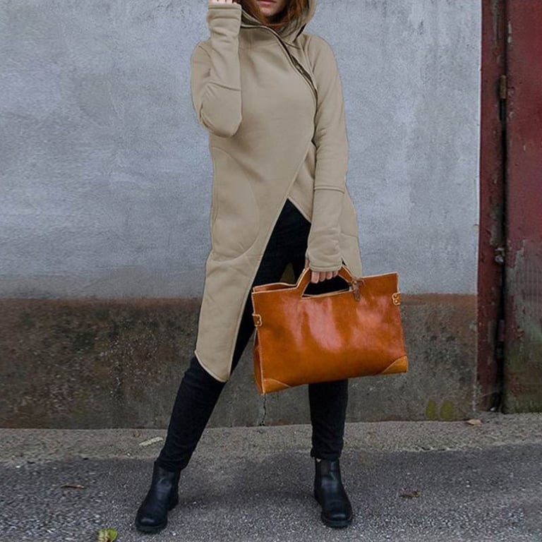 Manta longa estilosa com corte assimétrico e bolsos profundos.