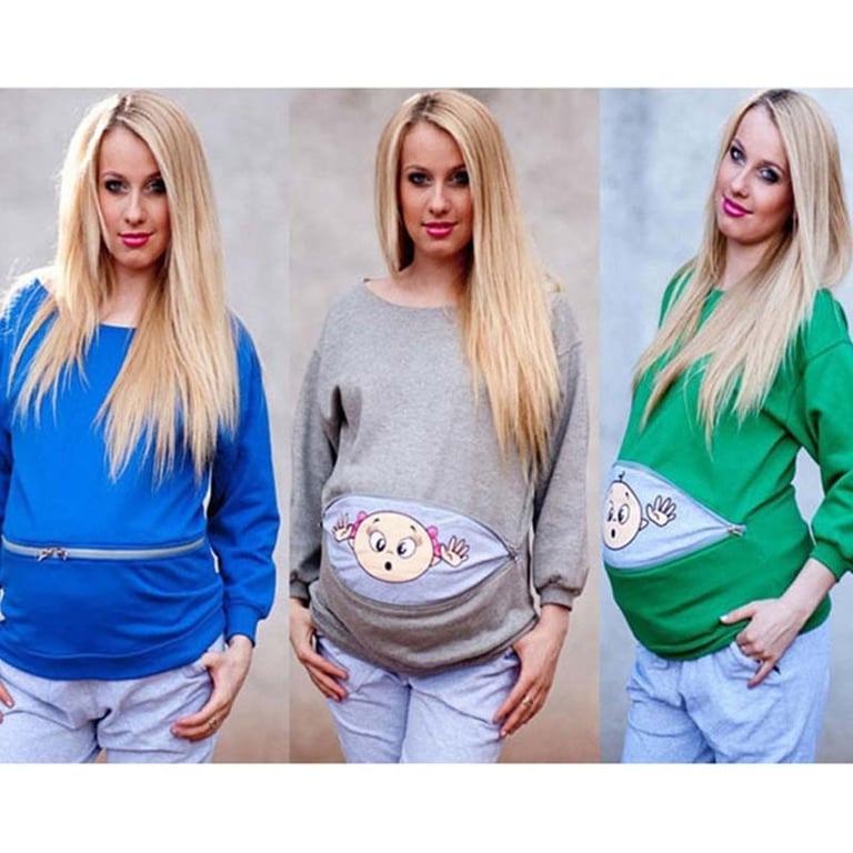 Confortável sweatshirt feminina com o motivo de um bebé no bolso, que pode ser usada fechada ou aberta.