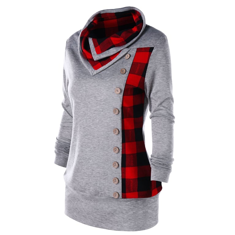 Sweatshirt feminina cinza com decoração xadrez. É adornada com botões e tem um colarinho alto. Ideal para a primavera.