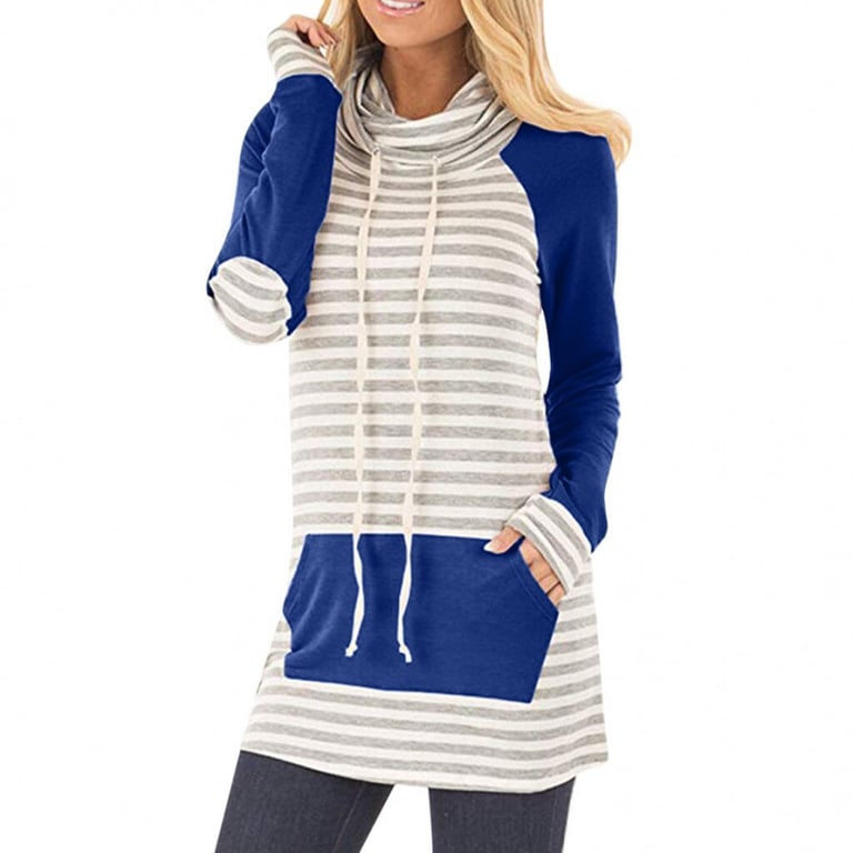 Sweatshirt feminina com capuz e mangas longas. Corte solto e mais longo com bolso canguru na parte da frente. Padrão listrado. Disponível em várias opções de cores.