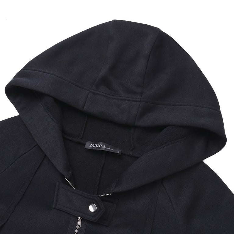 Moletom feminino estiloso preto com capuz. A parte de trás é mais longa. Fecha com zíper. Ideal para o tempo livre.