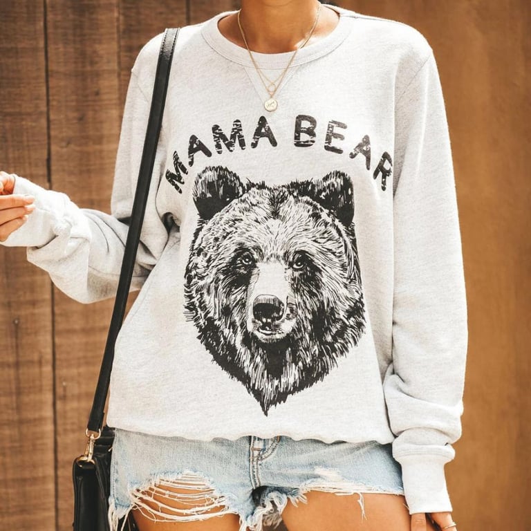 Sweatshirt feminina com decote redondo e mangas longas. Corte oversized solto. Impressão com o motivo de uma mamãe urso na parte frontal.
