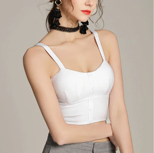 Este top crop corselet com botões está disponível em várias versões: lisa, riscada. Ideal para dias quentes de verão.