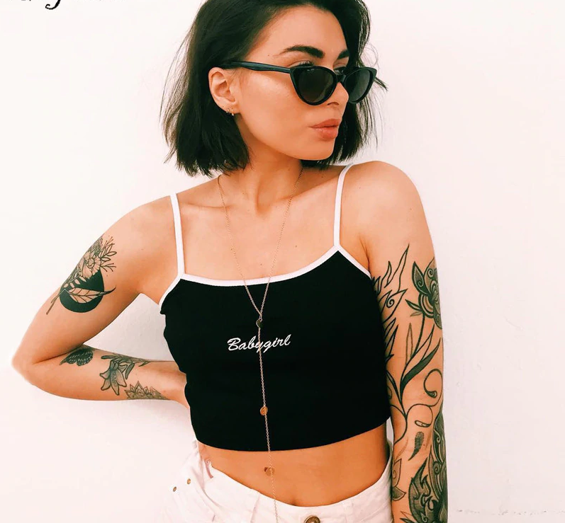 Top cropped desportivo feminino com a inscrição Babygirl. Tem alças finas brancas. Pode escolher nas cores rosa e preto.