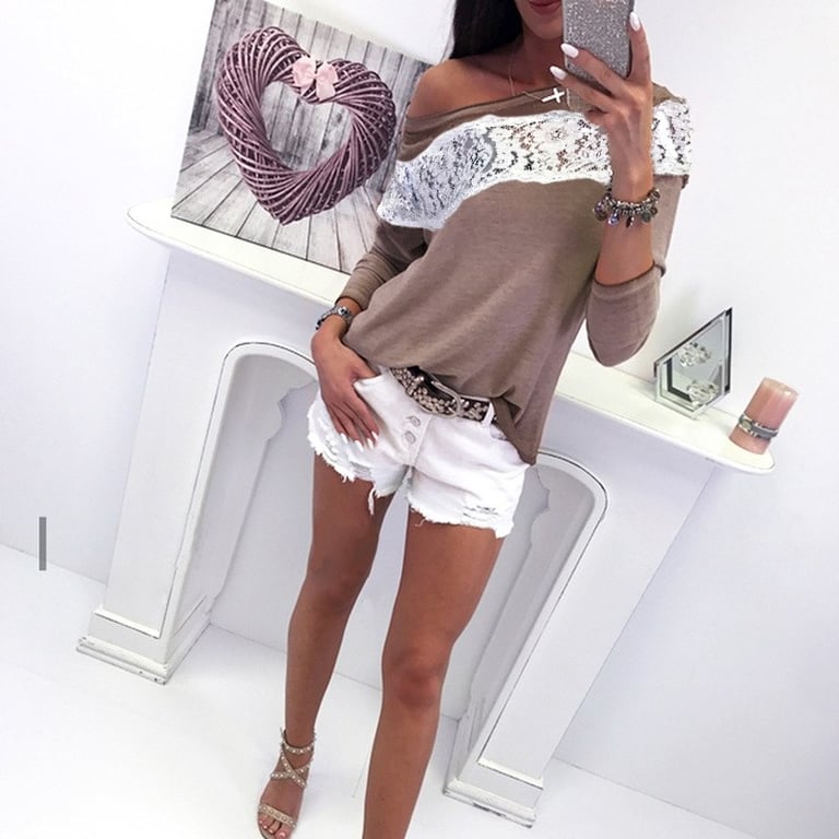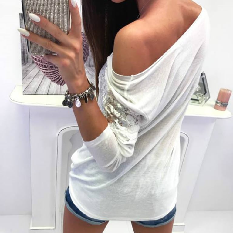 Top feminino com mangas 3/4 e faixa de renda. Corte moderno com ombros caídos.