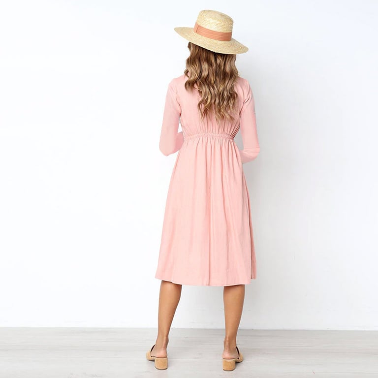 Vestido de outono feminino com mangas longas e decote em V. O vestido tem uma saia com comprimento abaixo do joelho e fecho de botões. Disponível em várias opções de cores.