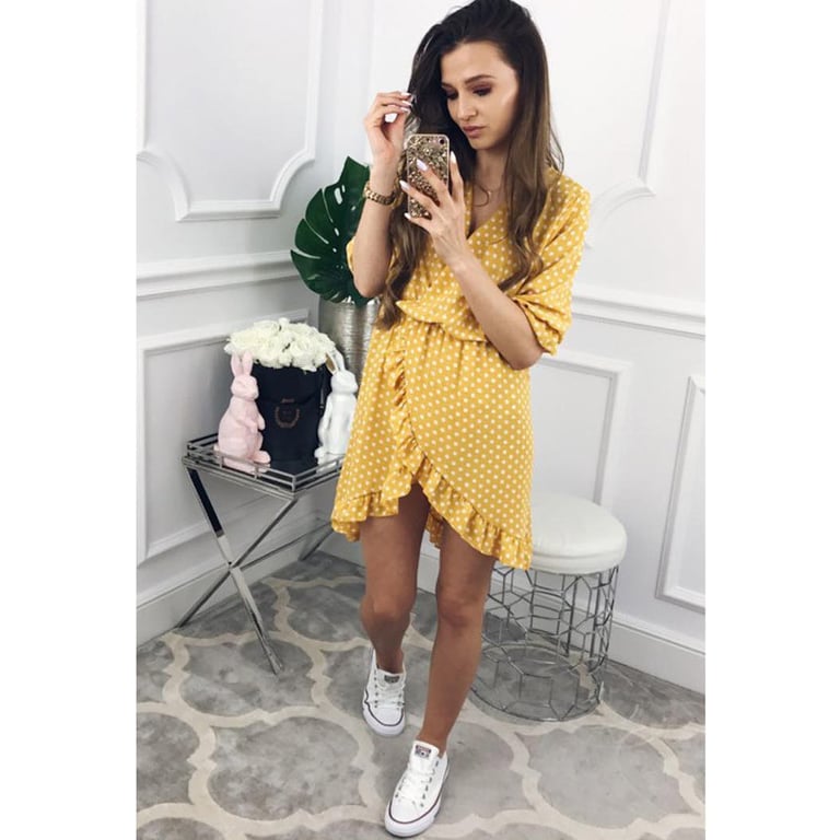 Vestido curto feminino com padrão de bolinhas. Com amarração na cintura e decote em V. Disponível em várias opções de cores.