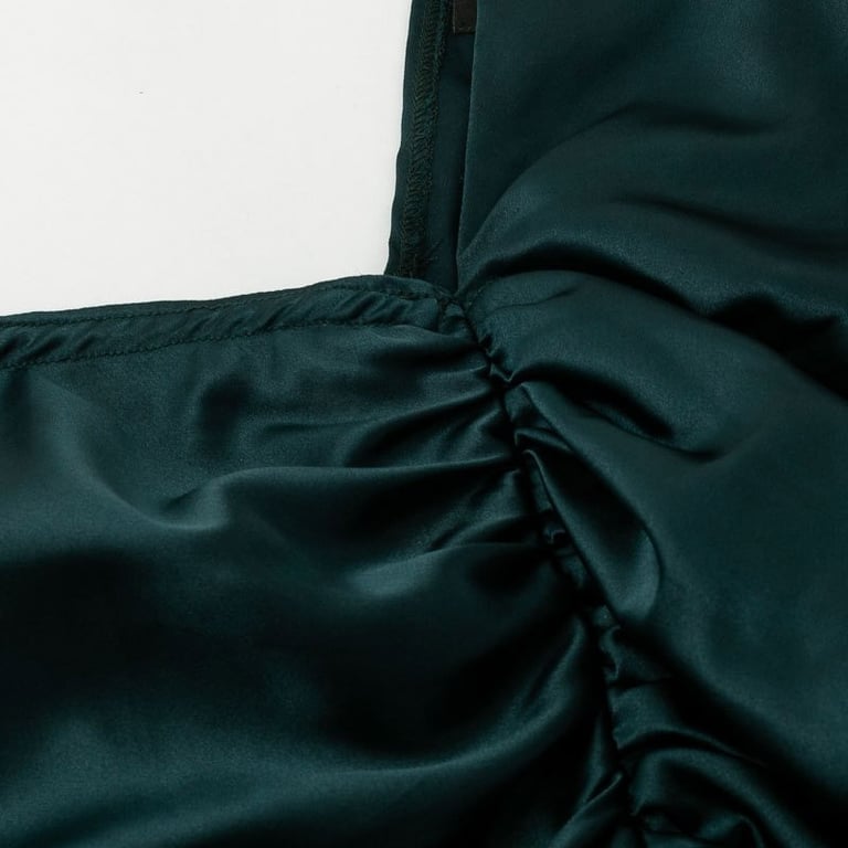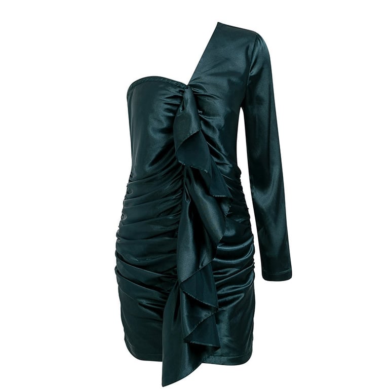 Vestido curto feminino de um ombro. O vestido tem uma manga longa e um ombro descoberto. Na parte da frente, é adornado com uma renda ao longo de toda a extensão.