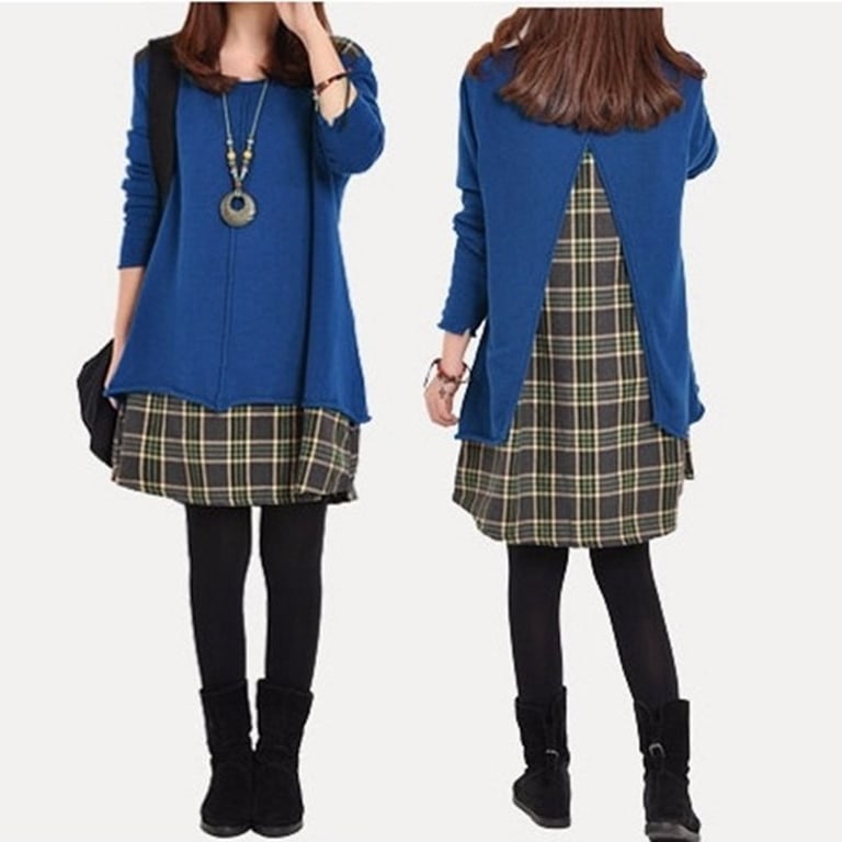 Vestido curto feminino em estilo vintage. O vestido tem decote redondo e mangas longas. Parte inferior embutida com padrão xadrez. Disponível em várias opções.