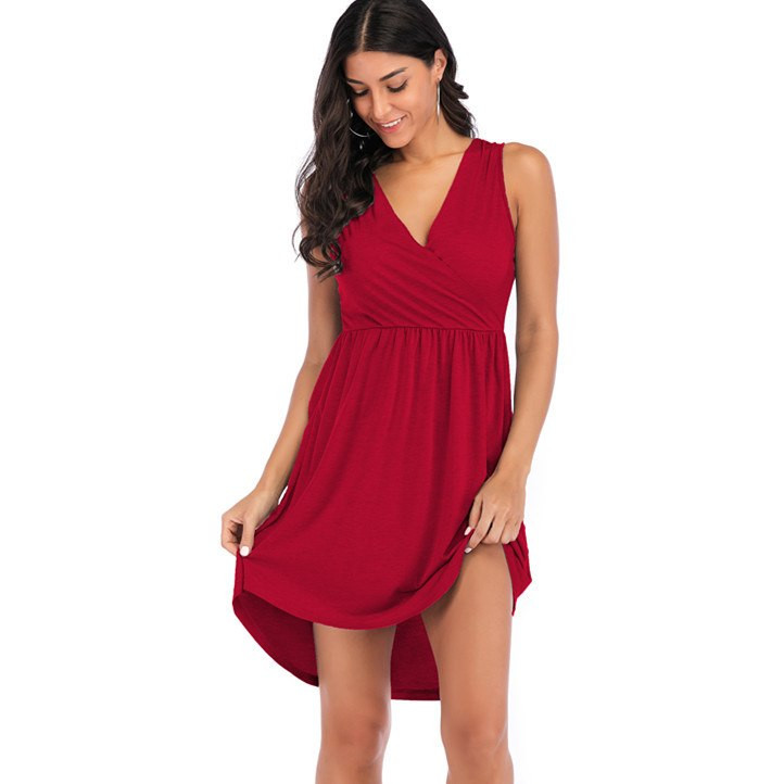 Vestido elegante feminino sem mangas com franzido na parte da frente. O vestido tem alças largas e um decote em V profundo. Disponível em várias opções de cores.