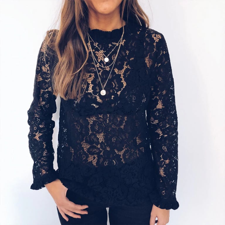 Blusa de renda feminina com mangas longas. O decote e as mangas são adornados com um delicado babado.