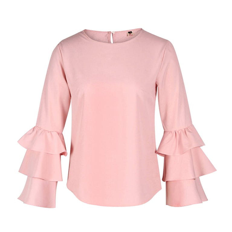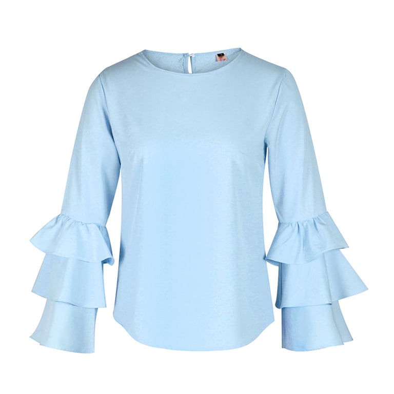 Blusa feminina com mangas longas, decoradas com babados. Tem decote redondo e fecha nas costas com um botão.