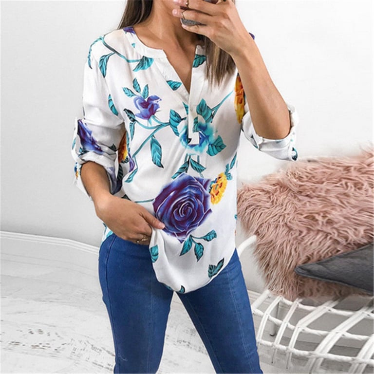 Linda blusa feminina feita de material delicado. Tem mangas longas, decote em V e um padrão floral estiloso.