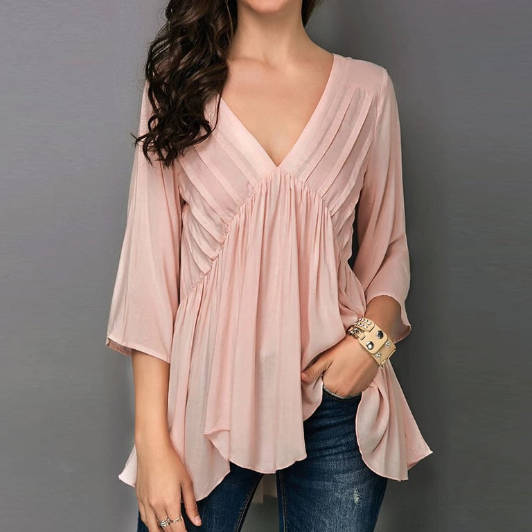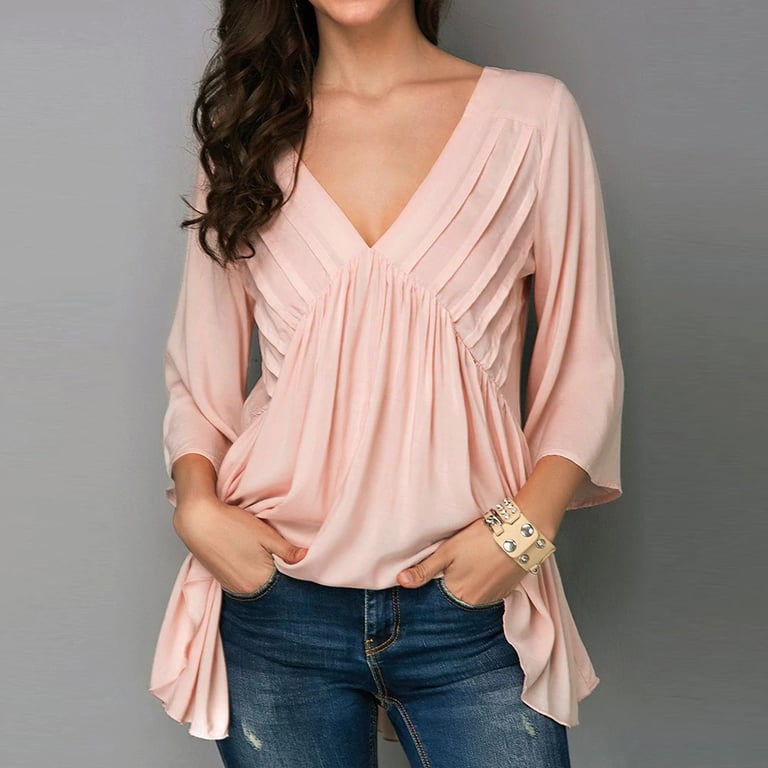 Blusa feminina rosa com mangas 3/4. Tem decote em V. Corte romântico delicado.