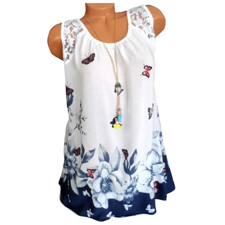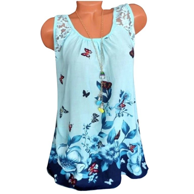 Top de verão feminino com alças de renda e um lindo estampado floral com flores e borboletas.