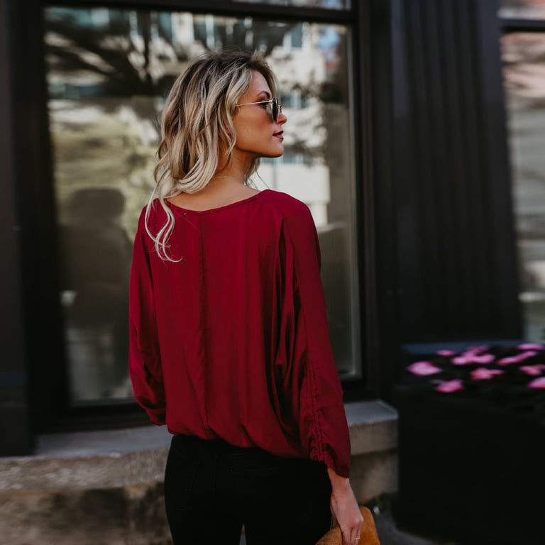 Esta linda camisa feminina tem botões brancos decorativos. É ligeiramente franzida na cintura com elástico e tem um decote profundo em V. Um corte elegante que favorece todas as mulheres.