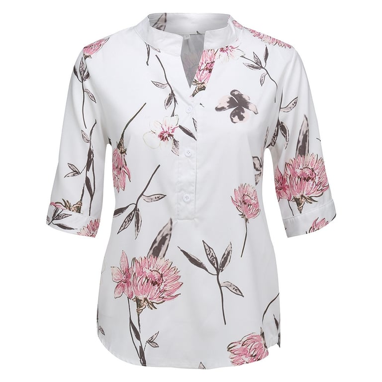 Camisa feminina com mangas 3/4. Tem decote em V e fecha com botões.
