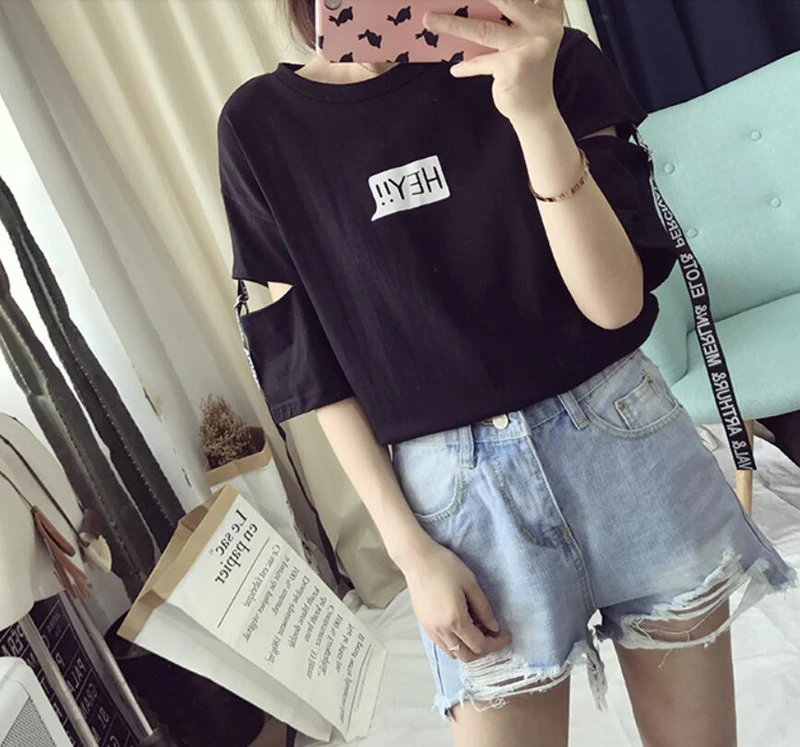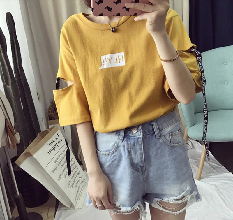 T-shirt feminina casual com inscrição e mangas curtas. As mangas fecham com fivela e cinto. Disponível em três cores da moda.