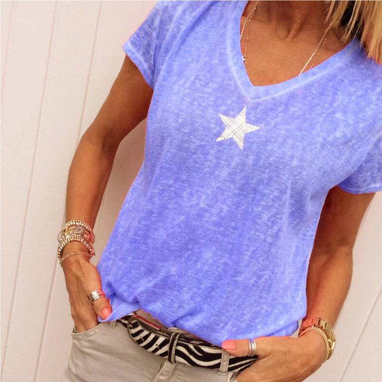 T-shirt feminina de mangas curtas. Está disponível em lindas cores neon e decorada com uma estrelinha. Ideal para o verão.