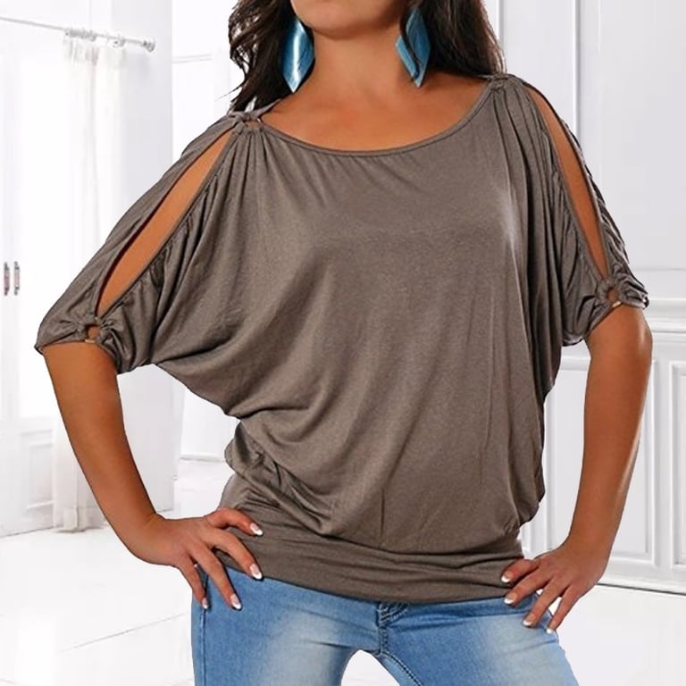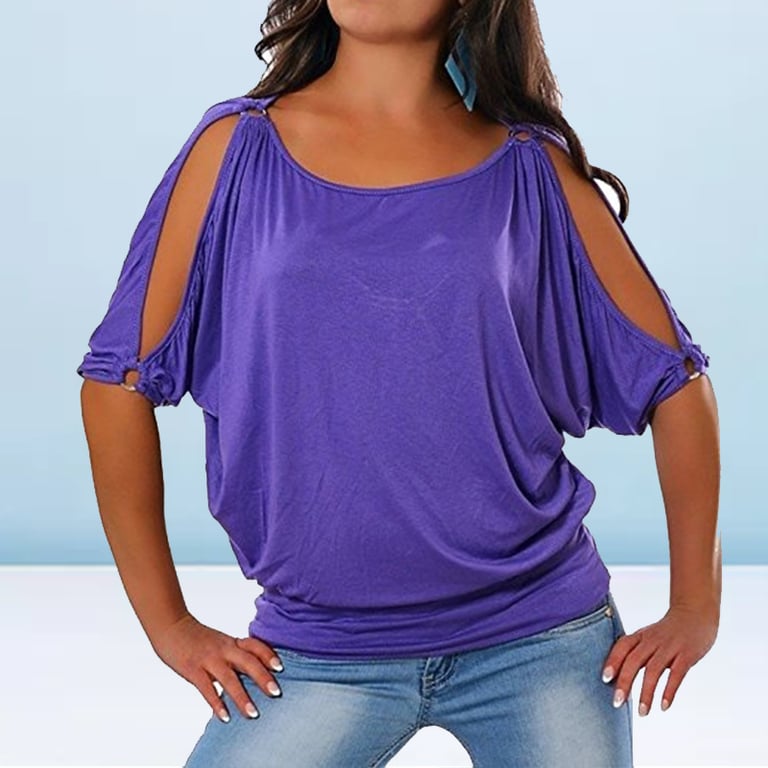 T-shirt feminina elegante com mangas curtas, nas quais há um amplo corte. Este está ligado por argolas em ambas as extremidades. A t-shirt tem um decote barco.