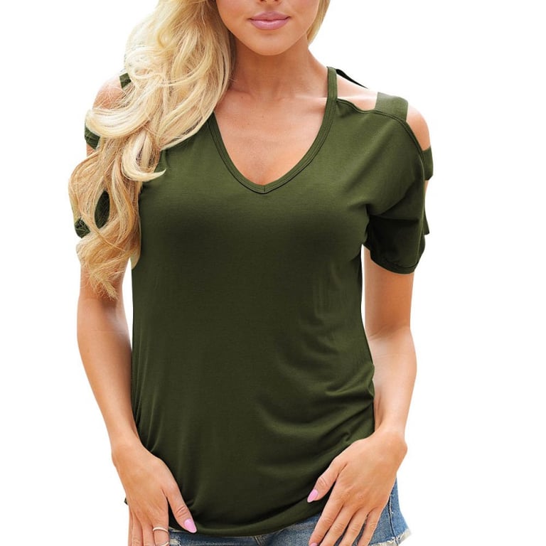 T-shirt feminina de mangas curtas. As mangas têm recortes modernos. A t-shirt tem um corte elegante.