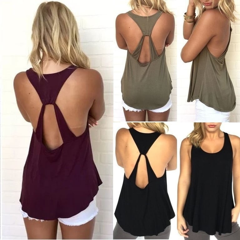 T-shirt de verão feminina com cruzamento na parte de trás. Corte solto. Disponível em três cores.