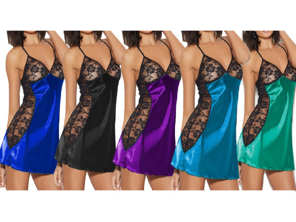 Camisola de noite feminina atraente decorada com renda preta. É feita de um material agradável e brilhante.